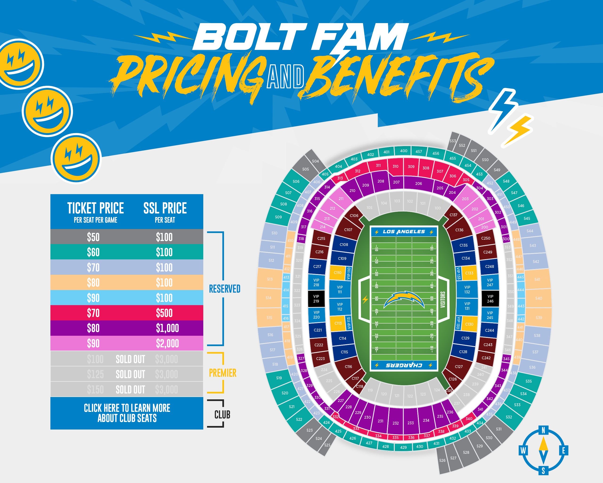 Club Seats for a Chargers home game features the best seating views most comfortable seats upscale food and drinks the closest parking and so much more. Access to exclusive club lounges. Chargers and Rams interactive seating chart at SoFi Stadium.
